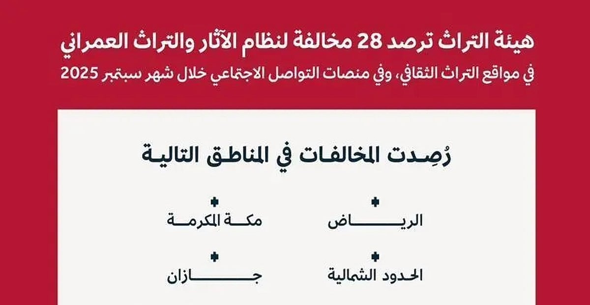رصدت هيئة التراث خلال شهر سبتمبر 2025م (28) مخالفة لنظام الآثار، ضمن جهودها الرقابية لحماية مواقع التراث الثقافي والقطع الأثرية من التعديات، وتطبيقًا للأنظمة والتعليمات ذات الصلة في مختلف مناطق المملكة.