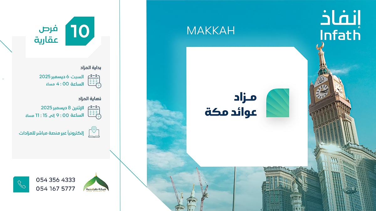 يطرح المزاد 10 فرص عقارية في مواقع استثنائية ومثالية في أهم أحياء مكة المكرمة وبالقرب من الحرم المكي ويتكون العقار الأول من فندق بمساحة 625 متر مربع بحي العزيزية وعلى طريق الحرم مباشرة وشارع العزيزية العام ، والعقار الثاني فندق بمساحة 907.5 متر مربع بحي العزيزية وعلى طريق مكة الطائف مباشرة ، والعقار الثالث أرض تجارية بمساحة 1,312.7 متر مربع بحي العزيزية وعلى طريق مكة الطائف مباشرة ، العقار الرابع أرض زراعية بمساحة 160,233.14 متر مربع بواجهة شمالية بطول 362 م على طريق الجموم – حداء مباشرة و مقام على جزء منها مباني ، العقار الخامس عمارة تجارية سكنية بمساحة 374.45 متر مربع بحي العتيبية وعلى طريق الحجون مباشرة ، العقار السادس عمارة تجارية سكنية بمساحة 600 متر مربع بحي الخالدية ، العقار السابع عمارة سكنية بمساحة 497 متر مربع بحي المسفلة (كدي) وبالقرب من طريق اجياد و جبل الثور ، العقار الثامن عمارة سكنية بمساحة 685.85 متر مربع بحي العزيزية و بالقرب من طريق الملك خالد وطريق مكة الطائف ، العقار التاسع عمارة سكنية بمساحة 400 متر مربع بحي بطحاء قريش النموذجي وعلى شارعين وبالقرب من طريق المسجد الحرام ، العقار العاشر عمارة سكنية بمساحة 219.20 متر مربع بحي ريع ذاخر وبالقرب من طريق جبل الثور .