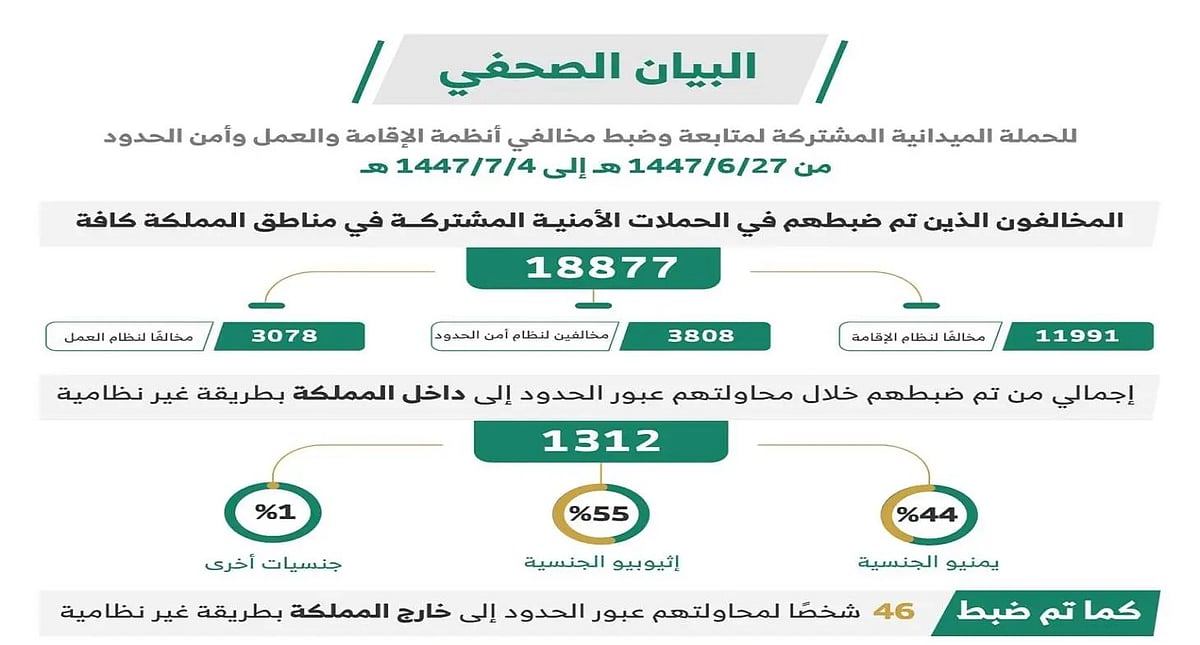 أسفرت الحملات الميدانية المشتركة لمتابعة وضبط مخالفي أنظمة الإقامة والعمل وأمن الحدود، التي تمت في مناطق المملكة كافة، وذلك للفترة من 27 / 06 / 1447هـ الموافق 18 / 12 / 2025م إلى 04 / 07 / 1447هـ الموافق 24 / 12 / 2025م، عن النتائج التالية: