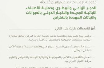 فعلى صعيد البيئة والأمن الحيوي، شكّلت التعديلات الشمولية على قوانين السلامة الأحيائية والحجر البيطري والحجر الزراعي وتنظيم الاتجار الدولي بالحيوانات والنباتات المهددة بالانقراض وحماية الأصناف النباتية الجديدة، نقلة نوعية في حماية التنوع البيولوجي والأمن الغذائي، وشملت تحديث التعريفات وتوسيع نطاق التطبيق وتشديد الرقابة على المنافذ الحدودية ومواءمة التشريعات الوطنية مع الاتفاقيات والمعايير الدولية، وإقرار عقوبات رادعة تُعزز الامتثال وتحد من المخاطر البيولوجية العابرة للحدود.